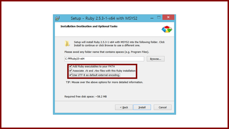・ Associate. rb and. rbw files with this Ruby installation : .rb와 .rbw 파일을 CMD에서 실행시킬 수 있도록 합니다.
