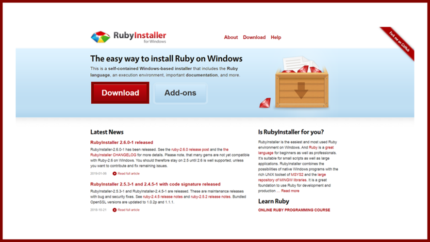 RubyInstaller의 홈페이지에 접속하여, Download를 클릭합니다.