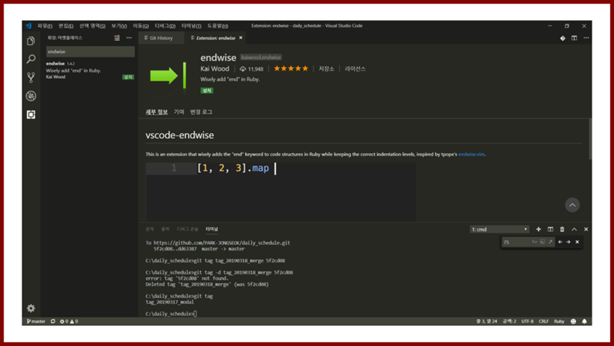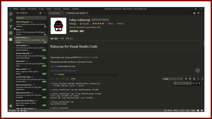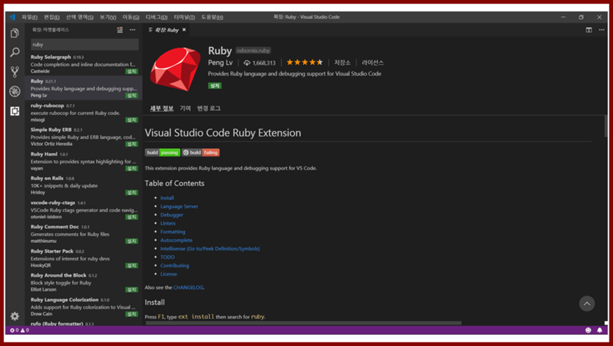 ・ 비주얼 스튜디오 코드의 확장 기능을 이용하여 루비로 개발할 때 도움을 주는 기능을 사용할 수 있습니다.